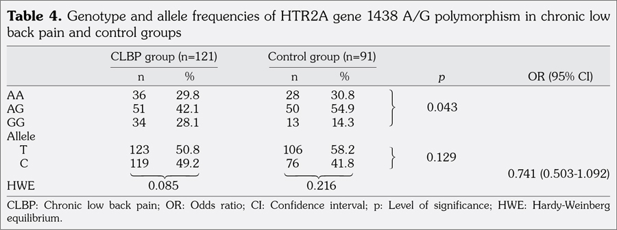 In the 102 T/C polymorphism of the HTR2A gene, the base in nucleotide position 102 may be thymine (T) or cytosine (C), with three possible genotypes as TT, TC or CC. These polymorphisms were evaluated in the patients diagnosed with CLBP and the healthy controls. The genotype distribution in each group was in accordance with the Hardy-Weinberg equilibrium (p>0.05). Table 3 shows the distribution of the genotype and allele frequencies of 102 T/C in both groups. The differences were not statistically significant between the two groups (p>0.05 for each).
