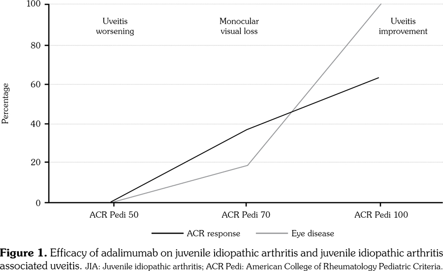 Patients and Methods: We retrospectively analyzed the data of 11 JIA patients (8 males, 3 females; mean age 14.5 years; range 9 to 18 years) with associated uveitis treated with biologic therapy. All patients were diagnosed as oligoarticular/extended oligoarticular or enthesitis-related JIA subtypes, treated with methotrexate, and had active or previous history of uveitis for which adalimumab was prescribed. We tested all patients for anti-nuclear antibody presence and human leukocyte antigen genotype. We assessed disease activity and therapy efficacy by American College of Rheumatology 50%, 70%, and 100% improvement criteria. We evaluated uveitis activity by slit-lamp biomicroscopy and recorded adverse events.