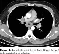 A 29-year-old male patient who had AS for 13 years applied to our rheumatology outpatient clinic for routine yearly control. His AS had been under control with etanercept for 43 months. After the routine follow-up evaluation, a thorax computed tomography scan was performed because of hilar enlargement in the chest X-ray. Multiple lymphadenopathies, the largest one with 2 cm in diameter, were detected in computed tomography scan (Figure 1).