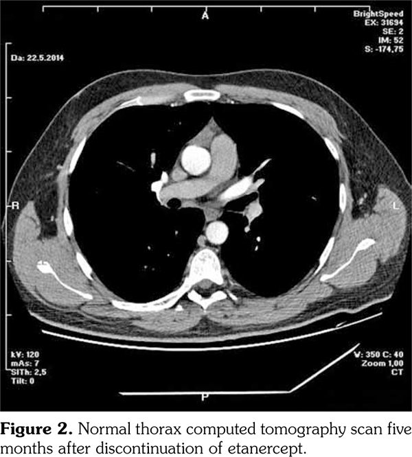 Tumor necrosis factor-alpha plays a role in the development of granulomatous diseases such as sarcoidosis.(7) On the other hand, infliximab, an anti-TNF-α monoclonal antibody, has been shown to be effective in the treatment of pulmonary sarcoidosis while etanercept, a soluble TNF-α receptor fusion protein, has not.(3) Moreover, in a study including 17 patients with pulmonary sarcoidosis, etanercept treatment was found to be associated with aggravation of the disease.(8) In this article, we report an AS patient who was diagnosed as sarcoidosis during the period of etanercept usage.