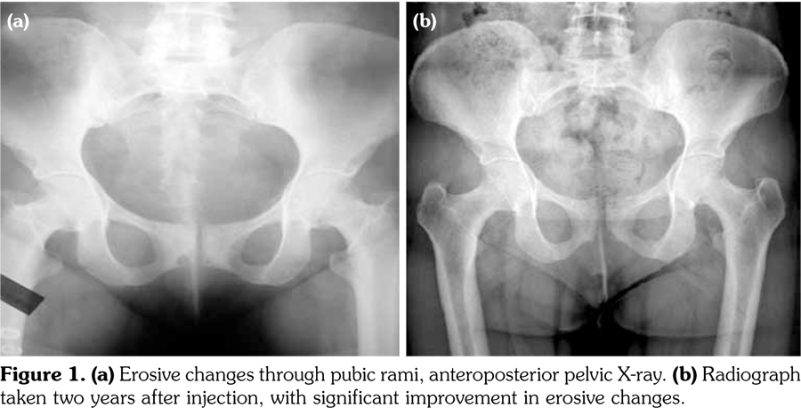 At two-year control visit, patient’s pelvic X-ray was normal. All the abnormal findings including the erosions through the pubic rami regressed significantly when compared to initial X-ray (Figure 1b).