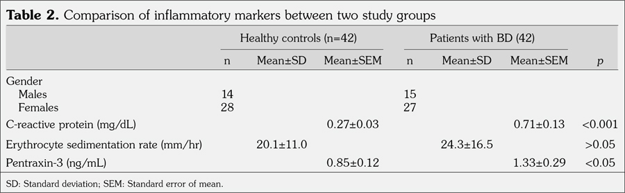 Patients and methods: Forty-two patients with BD (15 males, 27 females; mean age 39.7±8.6 years; range 20 to 64 years) and 42 age- and sex- matched healthy controls (14 males, 28 females; mean age 40.8±8.2 year; range 25 to 60 years) were included in the study. Serum CRP and plasma PTX-3 levels were measured. Subgroup analyses were performed according to clinical manifestations of patients with BD.