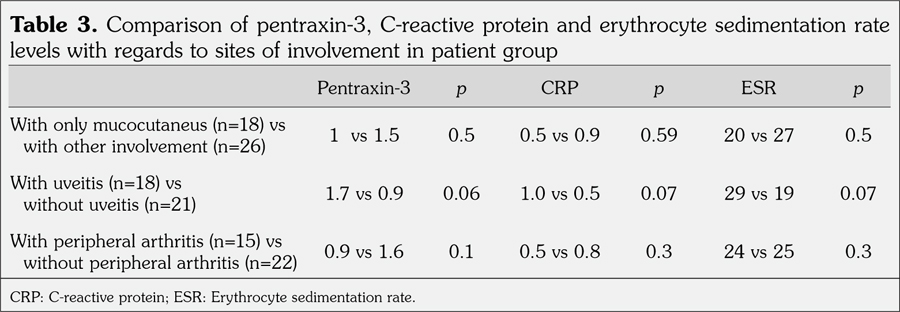 Behçet’s disease (BD) is a chronic, relapsing multisystemic disease characterized with nonspecific vasculitis that affects various sizes of vessels. The highest prevalence was reported in the Eastern Mediterranean and in Asia.(1,2) Inherited and adaptive immunity accompanied with bacterial and viral infections, activations of neutrophils, natural killers, and cytotoxic T cells were found to be responsible in the etiology.(3-5) BD’s association with human leukocyte antigen-B51 (HLA-B51) gene is well known, however there is no certain laboratory parameter for the diagnosis or follow-up of BD. Pentraxins (PTXs) are acute phase proteins that affect humoral arm of congenital immunity.(6) They are divided into two groups as short and long PTXs.(7,8) C-reactive protein (CRP) is the prototype of the short PTX family mainly produced in the liver in response to inflammatory signals and PTX-3 is the prototype of the long PTX family.(9,10) While CRP is produced by hepatocytes, PTX-3 is produced by different cell types and functions locally. Different from classic PTXs, PTX-3 is secreted as a response to interleukin-1 beta and tumor necrosis factor alpha. PTX-3 plays a complex role in vivo, recognizing a diverse range of pathogens modulating complement activity by binding C1q and facilitating pathogen recognition by macrophages and dendritic cells. Because of this extrahepatic synthesis in contrast to CRP, PTX-3 levels are believed to be a more reliable indicator of disease activity produced at sites of inflammation.(11) Increased levels of PTX-3 have been observed in some autoimmune disorders.(11,12) In small vessel vasculitis, PTX-3 levels correlate with clinical activity of the disease and represent a candidate marker for monitoring the disease.(11) Nevertheless, there is only one recent report investigating PTX-3 association in patients with BD and BD’s activity. Therefore, in this study, we aimed to assess the level of PTX-3 as an inflammatory marker and compare it with CRP levels in patients with BD.