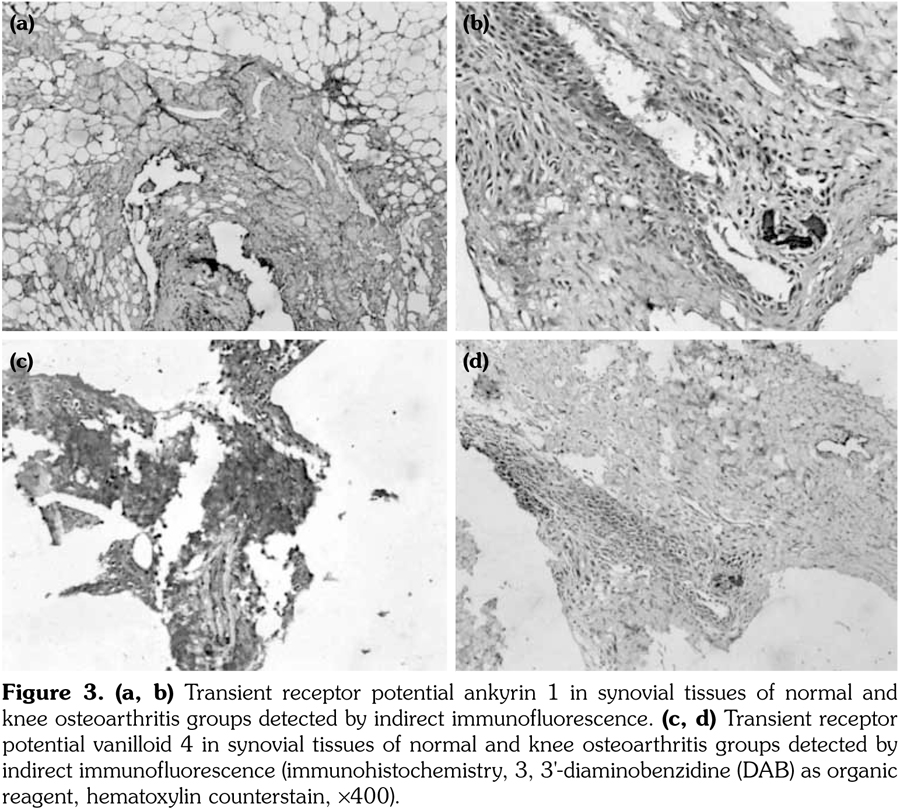 Distinct inflammatory infiltration was observed in synovial tissues of KOA group. Positive staining cells of TRPA1 and TRPV4 were identified in every sample, whose expressions in KOA group were statistically higher than those in both normal and KOA-antagonist groups (Figure 3).