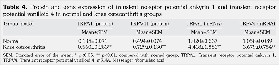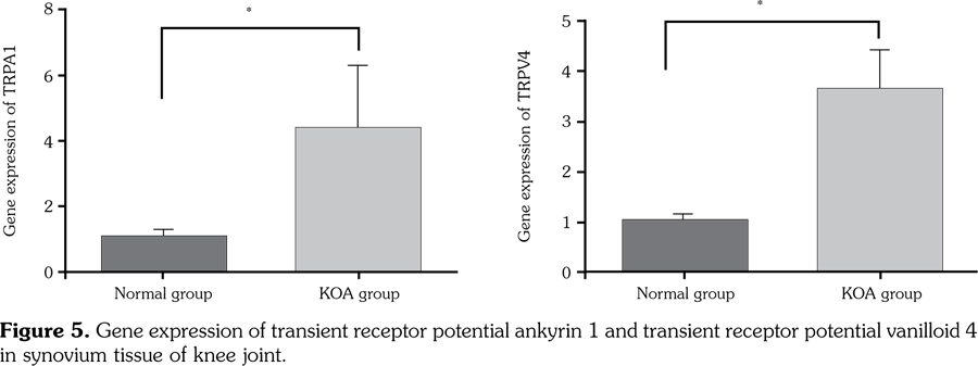 Both TRPA1 and TRPV4 expressions from diseased synovial tissues of KOA group were statistically higher than those of normal group (p<0.05) (Figure 4, Table 4). Both TRPA1 and TRPV4 gene expressions in KOA group were statistically higher than those in normal group (p<0.05) (Figure 5, Table 4).
