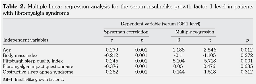Results: Sleep disorder was detected in 88 patients in FMS group and 15 patients in control group (p<0.05). The PSQI score was higher in the FMS group compared to the control group (9.9±4.6 vs. 5.7±3.5). The FIQ score was higher in the FMS group compared to the control group (53.4±17.4 vs. 26.4±13.9; p<0.05). The serum IGF-1 level of FMS group was significantly lower than that of the control group (140.6±49.5 ng/mL vs. 177.2±58.5 ng/mL; p<0.05). In the FMS group, an examination of the correlation between serum IGF-1 level with the age, body mass index, obstructive sleep apnea syndrome, FIQ, and PSQI revealed a negative correlation between serum IGF-1 with the age and PSQI. The obstructive sleep apnea syndrome ratios of study groups were comparable with regard to the frequencies of mild, moderate, and severe obstructive sleep apnea syndrome.