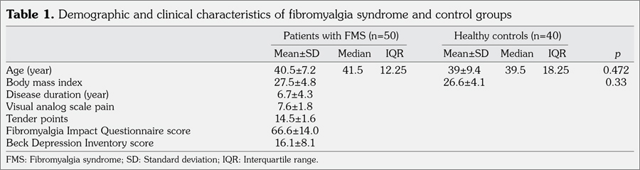 There were no statistically significant differences in age and BMI between the groups (p>0.05). The disease duration, mean FIQ scores, and BDI scores were 6.7±4.3 years, 66.6±14.0, and 16.1±8.1 in FMS group, respectively. The demographic and clinical characteristics of FMS and control groups are presented in Table 1.