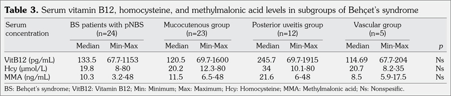The median serum levels of VitB12, Hcy, and MMA in the participants are shown in Table 2. There was no significant difference between the groups regarding serum VitB12, Hcy, and MMA levels (p>0.05). Serum VitB12 levels were below the lower limit and serum Hcy levels were above the upper limit in all participants. Methylmalonic acid levels were normal in all participants. There was no significant difference between the sub-groups of BS regarding serum VitB12, Hcy, and MMA levels (p>0.05) (Table 3). There was no correlation between the serum levels of VitB12, Hcy, and MMA and disease activity (p>0.05). There was no statistically significant difference in the serum levels of VitB12, Hcy, and MMA between patients receiving or not receiving colchicine.