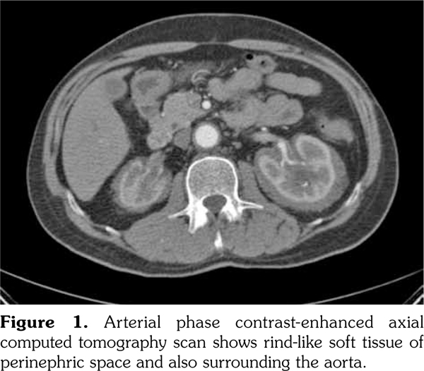 In our case, computed tomography findings suggested retroperitoneal fibrosis but the infiltrate did not involve the vena cava and the paraaortic infiltration was circumferential instead of sparing the posterior aspect of the aorta. Also, the perinephric infiltration was far more striking than the perivascular space which is inconsistent with retroperitoneal fibrosis. Therefore, the differential diagnosis consisted mainly of processes involving perinephric and perivascular spaces, namely, lymphoma, retroperitoneal fibrosis, and ECD. The diagnosis of ECD was strongly suggested with the radiographic findings of the extremities which revealed symmetrical dia-metaphyseal osteosclerosis.