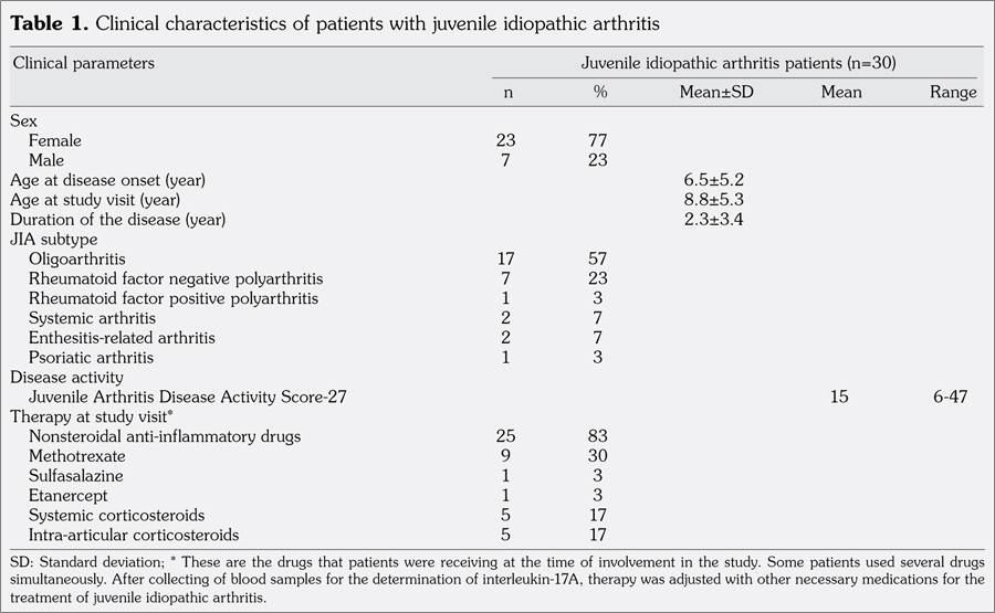Patients and methods: The study included 30 children (7 boys, 23 girls; mean age 8.8±5.3 years; range 1 to 18 years), who had been diagnosed with JIA (18 children were diagnosed during the study period and 12 children were diagnosed before the start of the study) and had active disease during the study period. Control group included 30 healthy, age- and sex- matched children (9 boys, 21 girls; mean age 8.3±4.8 years; range 1 to 18 years). The enzyme-linked immunosorbent assay was used to assess the serum IL-17A levels of children with JIA in the active phase of the disease and control group. Clinical and laboratory features of the disease were evaluated for the children with JIA.