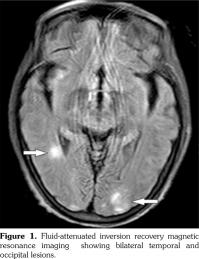 A 65-year-old female patient was admitted because of upper extremity shaking and lower extremity weakness for one day, fatigue, and anorexia for more than two months. She was firstly suspected of Parkinsonian syndrome. Levodopa and benserazide hydrochloride tablets were administered. However, her condition deteriorated aggressively, and it was hard for her to walk. Meanwhile, there were no complaints of rash, oral ulcer, baldness, arthritis, or photosensitivity. She denied headache, dizziness, vomiting, confusion, or double vision. Interestingly, she suffered from dry mouth and dry eyes for several months. She had never smoked or consumed alcohol, or received any suspected drugs. Physical examination was significant for fractured teeth and decreased myodynamia with 4/5 strength of upper extremity and 2/5 strength of lower extremity symmetrically. Laboratory tests revealed elevation of the 24-hour urine protein (1.20 g), positive autoantibodies (antinuclear antibody, anti- Smith, anti-double stranded deoxyribonucleic acid antibody) and decreased complement. SLE was diagnosed.(3) The positive tests of anti-Sjögren syndrome A antibody and Schirmer test, ocular staining score (>3) combined with clinical symptoms supported the diagnosis of SS,(4) but the patient refused labial salivary gland biopsy. Furthermore, PBC was diagnosed according to her raised alkaline phosphatase and positive serum anti-mitochondrial antibodies, excluding other causes of cholestasis. However, she rejected liver biopsy. Magnetic resonance imaging of the brain revealed symmetrically patchy lesion involving predominantly the subcortical white matter of the bilateral temporal and occipital (Figure 1). Therefore, she was ultimately diagnosed with PRES, SLE, SS, and PBC. Treatment was initiated immediately, including methylprednisolone 80 mg once a day, cyclophosphamide 400 mg∞3 days, plasmapheresis, and hypotensor. Several days later, her clinical symptoms improved greatly. Repeated magnetic resonance imaging was performed two months later, showing that the lesion had almost disappeared. Urinary protein proved to be 0.06 g/24 hour in follow-up. A written informed consent was obtained from the patient.