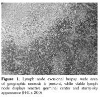 Bone marrow trephine biopsy showed slightly hypocellular marrow for the patient’s age, with trilineage hematopoiesis. Cervical lymph node excision was performed, which showed large areas of geographic necrosis with prominent nuclear debris and sheets of plasmacytoid dendritic cells. The background consisted of histiocytes, lymphocytes, and few eosinophils. The residual lymph node showed reactive germinal centers and tingible body macrophages, but no hemophagocytosis (Figure 1). These findings were consistent with necrotizing lymphadenitis of KFD. During the course of investigations, the high grade daily spiking fever persisted for twelve days and then resolved by itself.