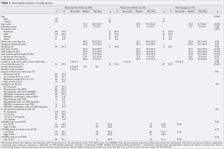The study, which was conducted at Kartal Dr. Lütfi Kırdar Training and Research Hospital between November 2015 and February 2016, included 206 patients with RA (34 males, 172 females; mean age 49 years; range 20 to 72 years) who fulfilled the 2010 American College of Rheumatology (ACR)/European League Against Rheumatism RA Classification Criteria,(12) 57 patients with FM (57 females; mean age 48 years; range 20 to 71 years) who fulfilled the 2010 ACR Preliminary Diagnostic Criteria for FM,(13) and 50 patients with OA of hand (4 males, 46 females; mean age 43 years; range 43 to 77 years) who fulfilled the 1990 ACR Classification Criteria for OA of Hands.(14) FA beliefs were measured by The Fear-Avoidance Belief Questionnaire (FABQ), originally described by Waddell et al.(15) The questionnaire has two components including FA beliefs about work and physical activity. Main determinants of the scale are pain related fear and pain severity. The FABQ is accepted as one of the best available instrument to measure fear and avoidance behavior related with physical activity and work.(16) In our study, we measured FA beliefs with modified version of The Fear- Avoidance Belief Questionnaire (mFABQ).(17) In the modified version of the questionnaire, two items which evaluate only back pain were excluded. The questionnaire includes four items on FA beliefs about physical activity and 10 items on FA beliefs about work. Here, all items were rated on a seven point scale (0-6). The validity and reliability of the questionnaire have been reported in patients with chronic musculoskeletal pain(17) and the Turkish version of mFABQ was previously validated.(18) Three different scores were obtained from the questionnaire: mFABQ physical activity score was derived from the ratings of four items on FA beliefs about physical activity. mFABQ work score was derived from the ratings of 10 items on FA beliefs about work. Finally, mFABQ total score was sum of these two scores. All scores dichotomized as low (mFABQ physical activity score [0-6], mFABQ work score [0-12] and mFABQ total score [0-18]) or high (mFABQ physical activity score [7-24], mFABQ work score [13-60] and mFABQ total score [19-84]) according to medians of a previous study.(19) All patients were literate and none of the patients had pathological finding in the examinations that may influence the questionnaire. Demographic features, duration of education, smoking habits, occupation, body mass index, visual analog scores of pain, fatigue and patients global health, duration of disease related symptoms, comorbid illnesses (hypertension, hypothyroidism, hyperthyroidism, cardiovascular diseases, coronary artery diseases, cerebrovascular diseases, chronic renal disease, chronic obstructive pulmonary disease, diabetes mellitus), and number of lost days being unable to work due to pain during last month were collected from all patients. Counts of tender and swollen joints of the patients with RA were detected with physical examination by the same rheumatologist. C-reactive protein and sedimentation rates of all patients and rheumatoid factor and anti-citrullinated protein antibodies of the patients with RA were obtained from the medical database of the hospital. Treatments for RA at the time of study were also obtained. Drug treatments for RA were classified as no treatment, monotherapy with methotrexate, monotherapy with other disease modifying drugs (DMARDs) (hydroxychloroquine, leflunomide, sulfasalazine), DMARD combination including methotrexate, DMARD combination without methotrexate, biologic monotherapy with tumor necrosis factor inhibitors (TNFi) (adalimumab, certolizumab pegol, etanercept, golimumab, or infliximab), biologic monotherapy with non-TNFi (abatacept, rituximab, or tocilizumab), biologic and DMARD combination including TNFi, biologic and DMARD combination including non-TNFi. Corticosteroid treatment for RA was classified into three subclasses according to dosage: no steroid treatment, treatment with prednisolone equivalent <5 mg, 5-10 mg and >10 mg daily. The activity of RA was evaluated with disease activity score 28 with sedimentation rate.(20) Disease activity score 28 was classified as remission, low, moderate and high disease activity according to ACR/European League Against Rheumatism provisional definition of remission in RA for clinical trials.(21) RA patients were divided into two groups related to remission status. Herein, disease activity score 28 of 3.2 was accepted as cutoff value. Remission group involved patients with remission and low disease activity. Additionally, non-remission group involved patients with moderate and high disease activity. Furthermore, patients with RA were divided into two groups according to disease duration. In compliance with 2015 ACR Guidelines for the Treatment of RA, cutoff value of disease duration for separating the patients as early or established RA was accepted as six months.(22) Occupation of the patients was classified according to exertion levels as outlined in the Standards of United States Department of Labor as defined in the Dictionary of Occupational Titles.(23)