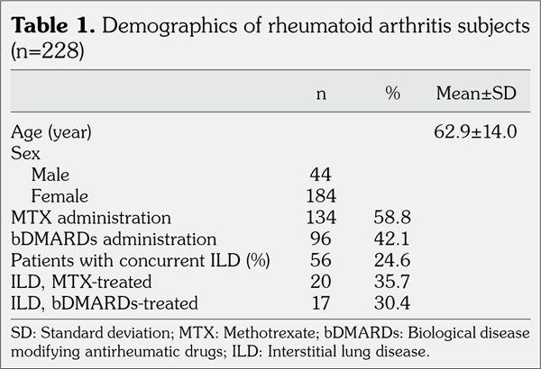 The study included a total of 228 RA patients (44 males, 184 females; mean age 62.9±14.0 years; range 23 to 88 years) who visited the Juntendo University Hospital between April 2010 and March 2014. Standards proposed by the 2010 American College of Rheumatology/ European League Against Rheumatism were used for the diagnosis of RA.(13) Autoimmune conditions were diagnosed based on the classification criteria for myositis.(14) and ILD was confirmed by histopathology or by the detection of interstitial infiltrates after chest radiography (X-ray generator, 0.6/1.2 P324DK-125, Shimadzu Corporation, Kyoto, Japan, and X-ray photoreceiver, flat panel detector CALNEO-U, Fujifilm Medical, Tokyo, Japan) or high-resolution computed tomography (CT, Aquilion ONE TSX-301C/3A, Toshiba Medical Systems Corporation, Otawara City, Tochigi-ken Japan). The study protocol was approved by the Juntendo University Hospital Ethics Committee. A written informed consent was obtained from each patient. The study was conducted in accordance with the principles of the Declaration of Helsinki.