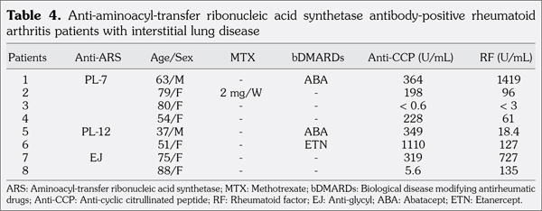 Results: Anti-ARS antibodies were detected in 14 RA patients (6.1%). ILD complications were significantly higher among anti-ARS antibody-positive patients (57.1% vs 22.4%, p<0.05). Levels of anti-threonyl-tRNA-synthetase (anti-PL-7) and anti-alanyl-tRNA-synthetase (anti-PL-12), two anti-ARS antibodies, were higher in RA patients with concurrent ILD (both p<0.05). Myositis and ILD worsening were not observed in three anti-ARS antibody- positive patients despite biological disease modifying antirheumatic drug administration. There was no difference in anti-cyclic citrullinated peptide and rheumatoid factor specificities between patients with or without ARS antibodies.