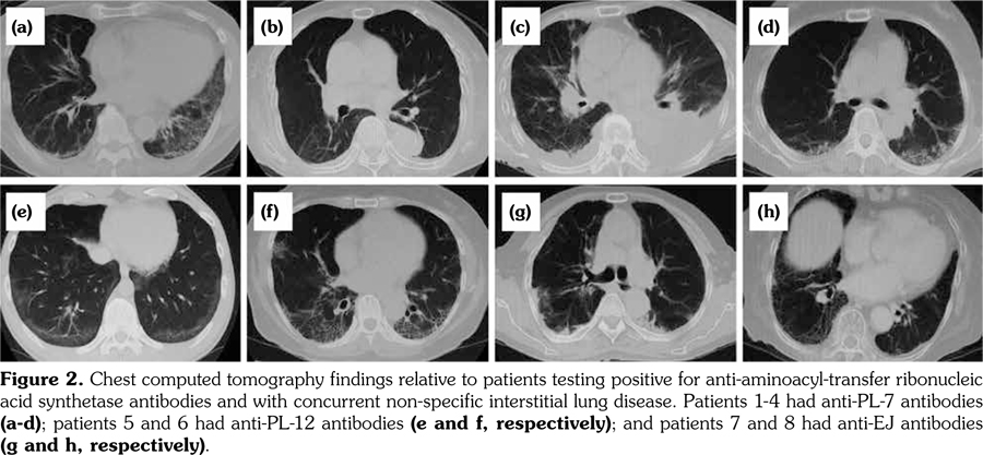 - Kalluri M, Sahn SA, Oddis CV, Gharib SL, Christopher-Stine L, Danoff SK, et al. Clinical profile of anti-PL-12 autoantibody. Cohort study and review of the literature. Chest 2009;135:1550-6.
