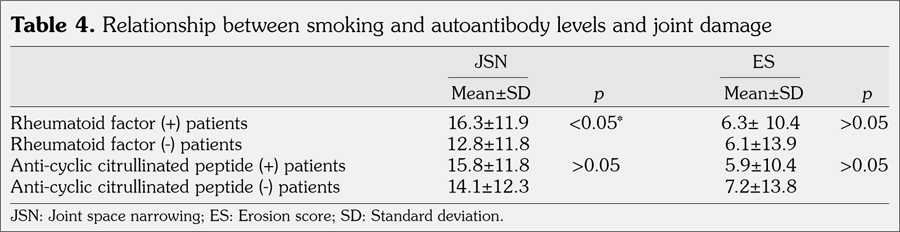 Relationship between smoking and radiologic damage, RF, and anti-CCP levels was examined. While there was no relationship between RF positivity and ESs (p>0.05), significant relationship was found with JSN score (Table 4).