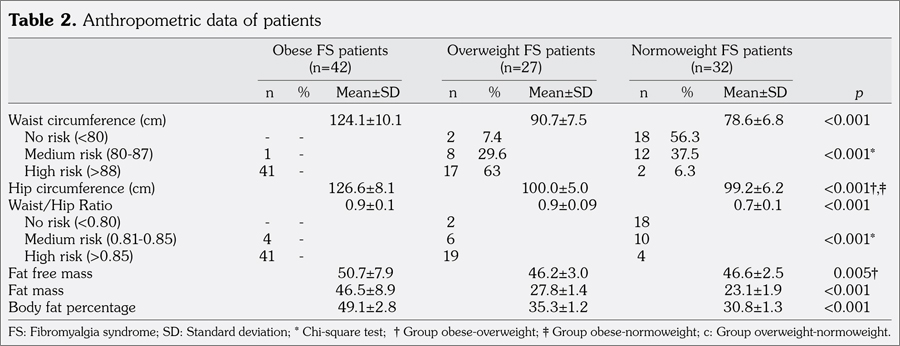 Patients and methods: The study included 42 obese (mean age 48.8±11.6; range 24 to 65 years), 27 overweight (mean age 47.3±3.4; range 24 to 61 years) and 32 normoweight (mean age 47.1±7.8 years; range 31 to 60 years) female FS patients. Widespread pain scores and symptom severity scores were noted. Pain pressure thresholds of tender points and control points were measured and total myalgic score (TMS) was calculated. The anthropometric assessments and skinfold measurements of all participants were recorded. Quality of life was evaluated by Health Assessment Questionnaire while psychological status was evaluated using Beck Depression Inventory.