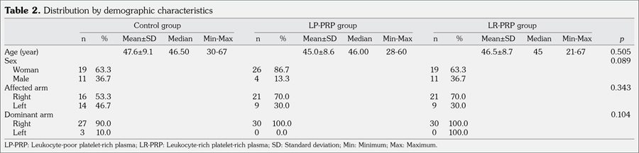 In the control group, the dominant arm was affected in 16 of 27 patients with right arm dominance and 21 of 30 patients with right arm dominance in LP-PRP and LR-PRP groups, respectively. Table 2 presents data distribution of demographic characteristics.
