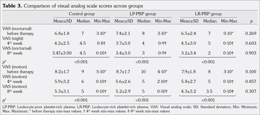 Results: No significant differences were detected between groups regarding VAS, Patient-Rated Tennis Elbow Evaluation, grip and pinch measurements, extensor tendon thickness and cortical derangement (p>0.05). In intra-group comparisons, VAS and Patient-Rated Tennis Elbow Evaluation scores obtained at fourth and eighth weeks were significantly decreased in all groups when compared to baseline values (p>0.05). Again, there was no significant difference in the control visit at eighth week when compared to baseline. Assessment of grip and pinch measurements revealed that values obtained at fourth and eighth weeks were significantly increased compared to baseline in all three groups (p<0.05). In leukocyte-rich-PRP group, a significant increase was detected in the values obtained at eighth week compared to those obtained at fourth week, but no significant change was detected in other groups. No significant difference was detected in extensor tendon thickness in any group. No significant difference was detected between groups in terms of paracetamol use and post-injection reactions.