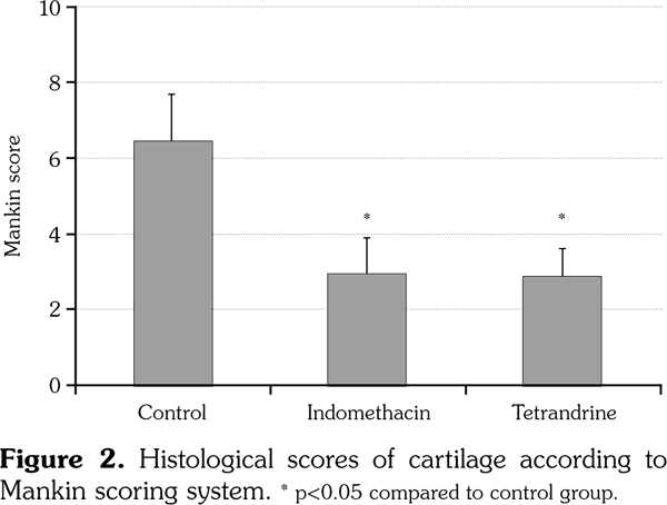 Specimens from the control group showed morphologic changes characteristic of OA. These changes included disarranged chondrocytes with degeneration or necrosis, ulcerations in the deep cartilage layer, and fibroplasia at the bottom of the ulcers (Figure 1a). In both the indomethacin and tetrandrine groups, histological changes associated with OA were clearly seen, but the severity was milder than in the control group (Figures 1b and c). Mankin scores in the indomethacin (2.94±0.98) and tetrandrine (2.85±0.74) groups were significantly lower than in the control group (6.45±1.23) (p<0.05), as seen in Figure 2. However, no significant differences between the indomethacin and tetrandrine groups were observed.
