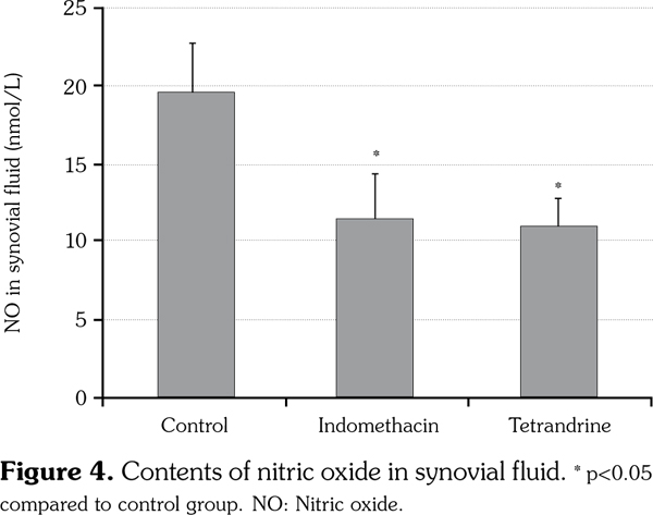 Results: In the tetrandrine group, the pathological changes were more attenuated than in the control group. Levels of interleukin-1 beta, tumor necrosis factor-alpha, nitric oxide and metalloproteinase-3 in the synovial fluid or synovium were all significantly suppressed in the tetrandrine group compared with the control group. There were no significant differences between the tetrandrine and indomethacin groups.