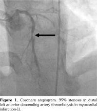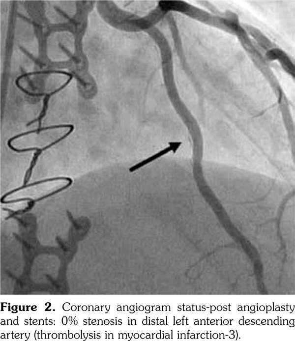 On admission, troponin was 0.05 ng/mL and electrocardiogram revealed sinus tachycardia with peaked T-waves in leads I, aVL, and V5-V6; and inverted T-waves in leads III and aVF. Echocardiogram demonstrated left ventricular hypertrophy with an ejection fraction of 55%. Selective coronary angiography (Figure 1) disclosed a 70% stenosis of the left internal mammary artery graft to the left anterior descending coronary artery and a 99% stenosis in the distal left anterior descending artery. Patient was treated with coronary angioplasty and two drug-eluting stents, reducing stenoses to 0% per final angiography (Figure 2).