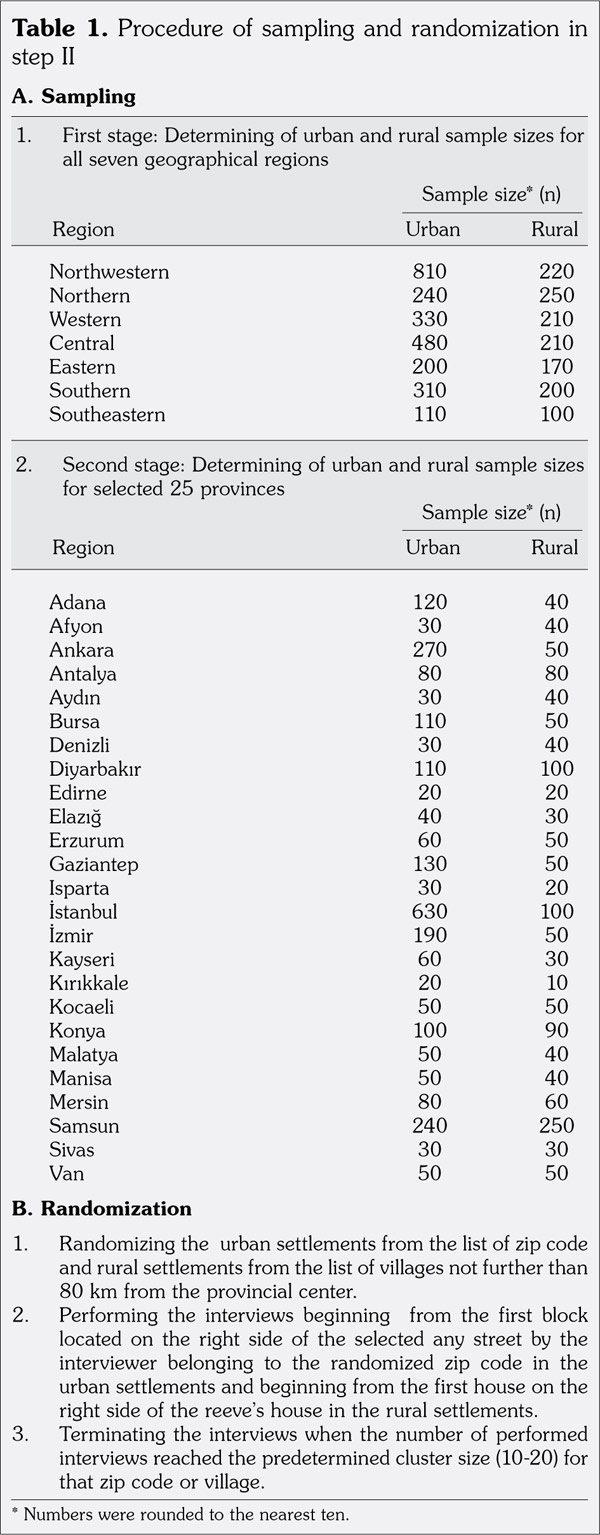 In step II, the validated Turkish questionnaire was administered face-to- face to randomly selected 4,012 subjects (1,670 males, 2,342 females; mean age 41.5±16.8 years; range, 16 to 97 years) by 20 trained general practitioners across the country for case detection. For randomization process, a two-stage cluster sampling method was used (Table 1). The first stage corresponded to all the seven geographical regions mentioned above and the second stage to 25 provinces: Adana, Afyon(karahisar), Ankara, Antalya, Aydın, Bursa, Denizli, Diyarbakır, Edirne, Elazı¤, Erzurum, Gaziantep, Isparta, ‹stanbul, ‹zmir, Kayseri, Kırıkkale, Kocaeli, Konya, Malatya, Manisa, Mersin, Samsun, Sivas, and Van (Figure 1). Two levels of either urban or rural settlement type defined the second stage. Urban clusters were selected by the proportional sampling method using zip codes and the rural clusters were sampled from the lists of villages not further than 80 km from the relevant provincial city center. The number of clusters was determined in proportion to the size of the urban and rural population of the relevant province. For intra-cluster sampling, a quota sampling method was used to determine the appropriate number of subjects according to the age and sex. The interviewer chose any street from the sampled zip code by his own will and started the interviews beginning from the first block on the right side of the street in the urban settlements or beginning from the first house on the right side of the reeve’s office in the rural settlements until he/she completed the predetermined cluster size. Inclusion criteria for the study were as follows: being 16 years of age or over, giving oral consent to participate in the screening, and being a citizen of Turkey. All the subjects belonging to the household and present on site during the screening were interviewed, but those who were cognitively impaired or unable to understand the questions, or unable to give clear answers were excluded. Any present visitors not belonging to the household but belonging to the same cluster were included; otherwise, they were excluded.