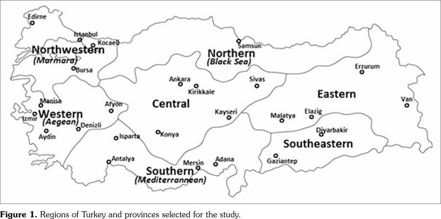 Turkey is a country divided into seven geographical regions (the Aegean [the Western], the Marmara [the Northwestern], the Mediterranean [the Southern], the Black Sea [the Northern], the Central, the Eastern, and the Southeastern) and 81 administrative provinces. Its population derived from the national census data was 67.8 million in 2000.(17)