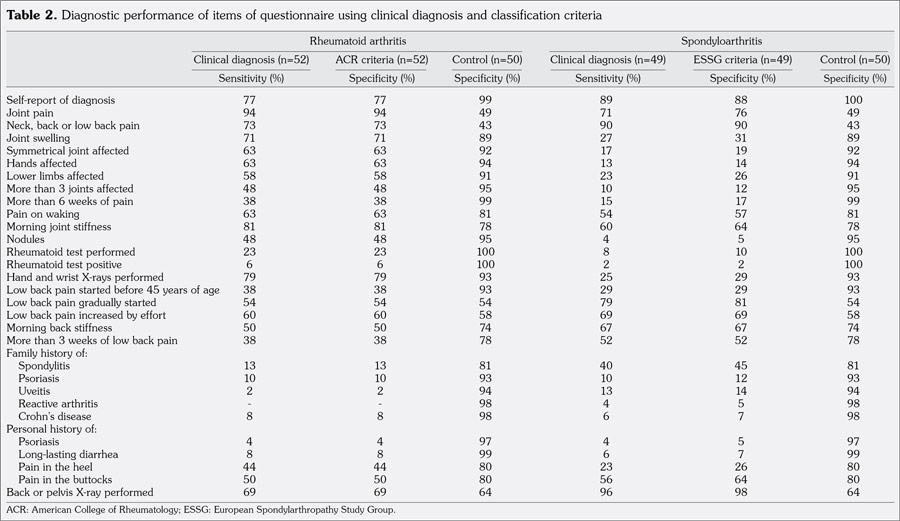 The sensitivity and specificity were calculated for each item of the questionnaire, separately and in combination, in reference to the clinical diagnosis and the classification criteria. Statistical analysis for step I was performed using SAS® 8.0 statistical software.