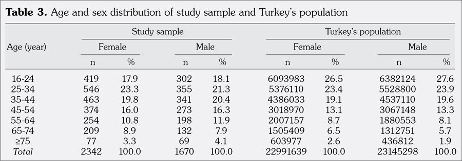 We found that at least 3,984 individuals needed to be included in our study, for an estimated prevalence of 0.03 and precision level of 0.01, corrected by a 1.6-fold increase for the impact of design at an α error level of 0.05. Using the direct standardization method, the prevalence estimates were adjusted for age and sex to Turkey’s population based on the data obtained in the 2000 Turkish national census. The 95% confidence intervals (CIs) were calculated as suggested.(18) Odds ratios and 95% CIs for regional variation of standardized prevalence estimates were obtained using MedCalc® statistical software version 17.6 (MedCalc Software bvba, Ostend, Belgium).