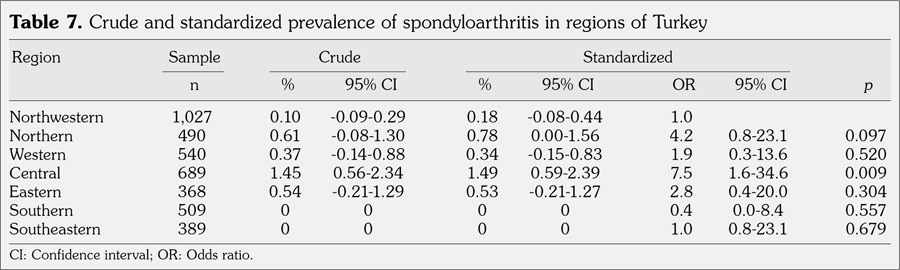 The standardized SpA prevalence for the general population of Turkey was calculated as 0.46% (95% CI; 0.25-0.67), 0.17% (95% CI; -0.03-0.37) for males and 0.65% (95% CI; 0.32-0.98) for females (Table 5). The highest prevalence of SpA was in the age group of 25-34 years (0.78%) (Table 4). The prevalence of SpA was highest in the central region (1.49%) pointing to a significant regional difference (p=0.009) (Table 7).