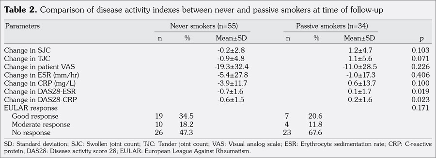 Patients and methods: Among a total of 191 female patients with RA (mean age 59.1±12.5 years; range 21 to 87 years) consecutively recruited, 100 female patients (mean age 56.1±13.4 years; range 21 to 87 years) completed the study with mean 17.3 months of follow-up. Patients were classified according to smoking status: current, never, passive, or ex-smoker. Clinical response between never and passive smokers was assessed by disease- activity score 28 (DAS28)-erythrocyte sedimentation rate (ESR) and C-reactive protein (CRP) (DAS28-ESR and DAS28-CRP) and by the European League Against Rheumatism response criteria.