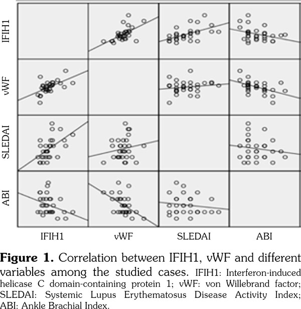 The strong positive relationship of IFIH1 and vWF with both types of vascular affection (arterial and venous) shows that both markers can indicate severe inflammation and ongoing destruction. IFIH1 gene may indicate endothelial dysfunction, increased plasma vWF levels and atherosclerosis in SLE.(6,7) Our study results supported this hypothesis by showing a statistically significant positive correlation between IFIH1 and vWF as a marker of endothelial dysfunction (p=0.001).