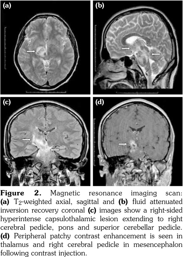 Involvement of CNS is reported to occur in 2.2-50% of patients with BD and it is more common in males with early onset BD.(2,3) CNS involvement includes parenchymal and non- parenchymal lesions. Clinical features frequently consist of findings of cranial nerve palsies, cerebellar ataxia, and corticospinal tract involvement. Parenchymal involvement is seen more (82%) and lesions are located mostly in brainstem, diencephalon, basal ganglion, and internal capsule.