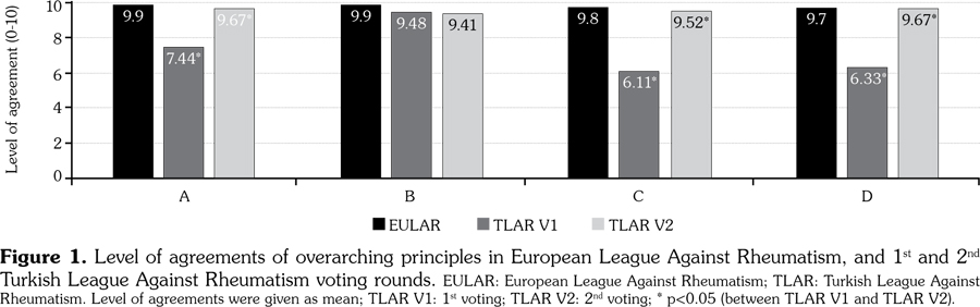 Results: Four overarching principles and 12 recommendations were assessed among which three overarching principles and one recommendation were changed. The changed overarching principles emphasized the importance of physical medicine and rehabilitation specialists as well as rheumatologists for the care of RA patients in Turkey. An alteration was made in the eighth recommendation on treatment of active RA patients with unfavorable prognostic indicators after failure of three conventional disease modifying anti-rheumatic drugs. Remaining principles were accepted as the same although some alterations were suggested but could not find adequate support to reach significance.