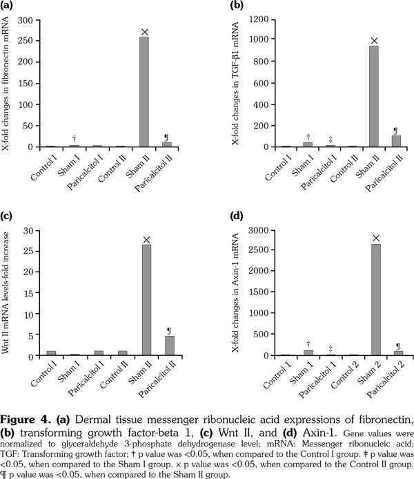 On the other hand, prophylactic paricalcitol application decreased TGF-β1 and axin-1 mRNA expressions (p<0.05 for both) but not fibronectin and Wnt-2 mRNA expressions. However, therapeutic applications decreased fibronectin, TGF-β1, Wnt-2 and axin-1 mRNA expressions (p<0.05 for all) (Figure 4).