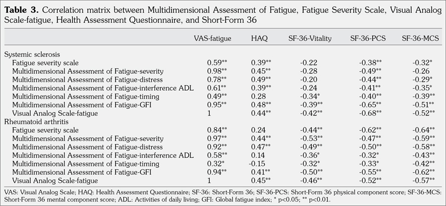 Results: Patients had similar educational and smoking status, as well as functioning and health related quality of life. However, patients with RA declared higher levels on visual analog scale-pain (p=0.012) and higher body mass index than patients with SSc (p<0.0001) and lower distances in six-minute walking test (p=0.002). Levels of fatigue were quite similar between patients with RA and SSc. Levels of fatigue, measured by different scales, were significantly correlated with physical functions and health related quality of life measures and psychometric variables in both groups; however, the correlation coefficients were relatively higher in patients with RA.