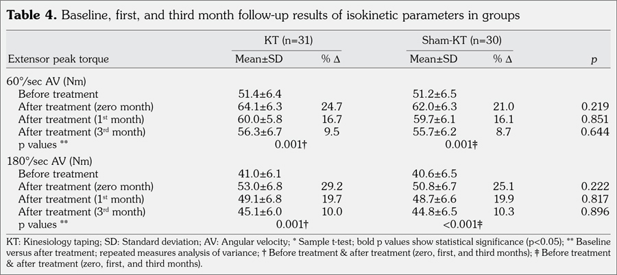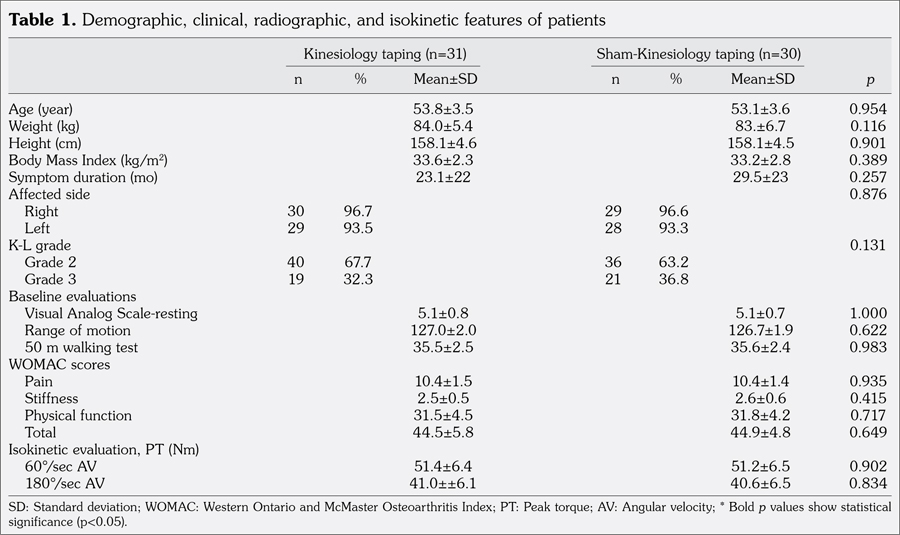 Patients and methods: The study included 61 female patients (mean age 53.5±3.5 years; range 50 to 60 years) who were admitted to Physical Medicine and Rehabilitation Outpatient Clinic with complaints of mechanical knee pain. Knee osteoarthritis was diagnosed according to the clinical/ radiological criteria of the American College of Rheumatology and patients with Kellgren-Lawrence grade 2 and 3 were included. Patients were randomly divided into two groups. Both groups received transcutaneous electrical nerve stimulation for 30 minutes, hot pack for 30 minutes, and therapeutic ultrasound for 10 minutes in a day for three weeks (five days in a week). Also, one group was treated with KT (KT group, n=31) while the other group was treated with sham-KT (sham-KT group, n=30) one time a week for three weeks. A home program of around the knee strengthening exercises was recommended for all patients. All patients were evaluated with visual analog scale, Western Ontario and McMaster Osteoarthritis Index (WOMAC) values, goniometric measurement of active knee range of motion, 50-meter walking distance, and isokinetic knee extensor muscle peak torque measurements before treatment, at the end of treatment, and at one month and three months after treatment.