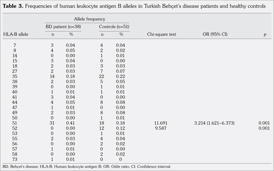 In our study, the HLA-B*52 allele was the third most common allele in healthy controls (11.7%). However, we did not observe this allele in BD patients (p=0.001). The allele frequency of the HLA-B*51 was significantly different between patients and controls and its frequency was significantly higher in patients compared to controls (40.7% and 17.6%; OR: 3.214 95% CI [1.621~6.373]; p=0.001, Table 3).