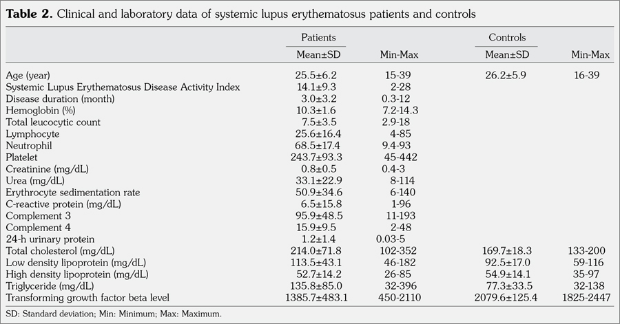 Patients and methods: The study included 40 female SLE patients (mean age 25.5±6.2 years; range 15 to 39 years) diagnosed according to the American College of Rheumatology criteria and 30 female healthy controls (mean age 26.2±5.9 years; range 16 to 39 years). Disease activity was assessed using SLE Disease Activity Index. Patients were diagnosed with lupus nephritis if they met the criteria for renal disorder. SLE patients and controls were compared in terms of TGF-β1, low and high density lipoprotein, and triglyceride levels.