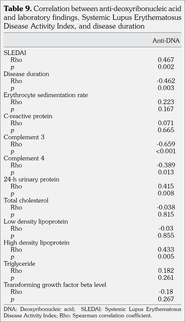 Systemic Lupus Erythematosus Disease Activity Index was statistically significantly correlated with erythrocyte sedimentation rate, serum cholesterol, triglyceride, and deoxyribonucleic acid levels (p values of 0.005, 0.025, 0.001, and 0.002, respectively) (Table 8). Deoxyribonucleic acid was statistically significantly correlated with disease duration, C3, C4, and 24-hour urinary protein (p values of 0.003, 0.001, 0.013, and 0.008, respectively) (Table 9).