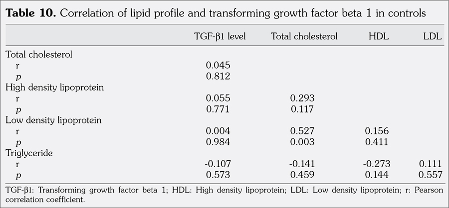 Mean serum TGF-β1 level of SLE patients was 1385.7±483.1 pg/mL with a significant difference compared with the control group (2079.6±125.4 pg/mL; p<0.001). There was a statistically significant difference in total serum cholesterol, LDL, and serum triglyceride levels between SLE patients and controls, with higher levels in the first group (p values of 0.001, 0.01, and <0.001, respectively) (Table 5).