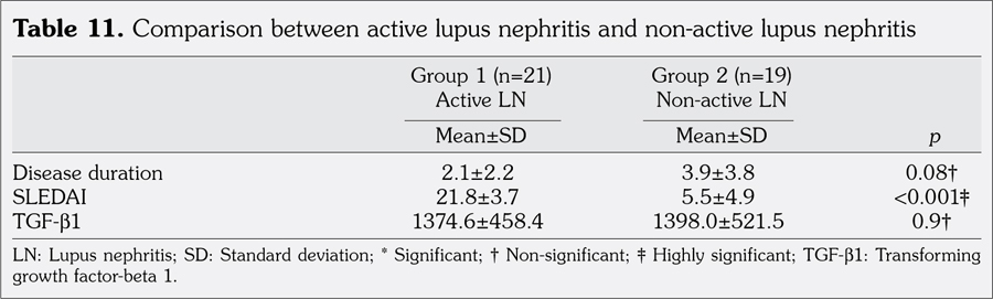 In our study, we found 21 patients with active nephritis, while we detected no statistically significant difference in serum TGF-β1 between active and non-active lupus nephritis group. Moreover, there was no statistically significant difference in TGF-β1 levels between patients with proteinuria more or less than 3 g. This was in contrary to Jin et al.,(21) who showed significantly lower levels of total TGF-β1 in patients with severe renal damage, i.e. lower TGF-β1 in patients with 24-hour urine protein of over 3.5 g than in those with below 3.5 g (p<0.05). This may be related to sample size as his sample included 150 SLE patients.
