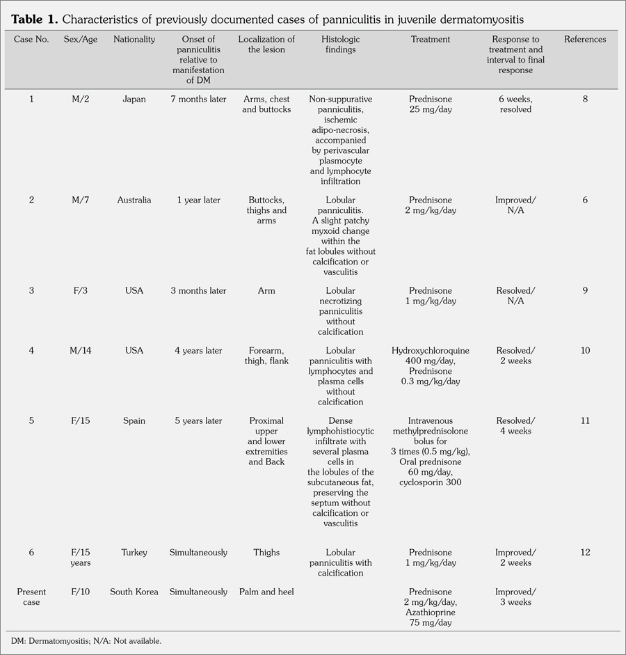 Panniculitis is a group of heterogeneous inflammatory diseases that involves the subcutaneous adipose tissue.(3) It commonly presents with erythematous, indurated subcutaneous nodules accompanied by tenderness and heating sensation and can result in calcifications and lipo-atrophy.(4-6) Although it is infrequently reported, according to an analysis based on histologic examination with 55 patients with DM, panniculitis was detected at a prevalence of 10%.(7) This discrepancy between pathologic studies and clinical reports may lead to a speculation that panniculitis is unrecognized clinically or under-reported. Panniculitis in patients with JDM has been documented in seven cases (Table 1,(6,8-12)) and we excluded the cases complicated with infections. The predilection sites were the extremities and buttocks, but eruptions were also observed in the palm and heels, as in our case. The mean age of patients was 11.5 years, and three of the seven patients were male. The histopathologic findings were similar. Lobular panniculitis without calcification or vasculitis was mostly found, except one case containing calcification. The onset time of panniculitis was diverse from concurrently to five years after JDM diagnosis, which is approximately three years after the diagnosis on average. The mainstay of treatment was high-dose steroid, and responses to steroid were mostly remarkable within a few weeks.