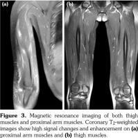 In a subsequent visit after one week, no symptomatic improvement was noted, and she complained of lower extremity weakness. The skin biopsy results revealed lobular panniculitis consisting of mixed neutrophilic and lymphocytic infiltration. Calcification or vasculitis was absent (Figure 2). The magnetic resonance images (MRI) revealed diffuse hyper-intense signal of the multiple muscles in the upper arm and thigh (Figure 3a and b). Laboratory tests yielded insignificant findings, except for aldolase (17.8 IU/mL; physiological range <7.6 IU/mL) and lactate dehydrogenase (799 IU/L; physiological range, 218-472 IU/L). Autoantibodies for antinuclear antibodies, including anti-Jo 1 antibody were not detected. A muscle biopsy specimen was obtained from a muscle in the thigh because JDM was suspected, and results were compatible with JDM. Based on the clinical and pathologic findings, JDM and JDM-associated panniculitis were diagnosed.