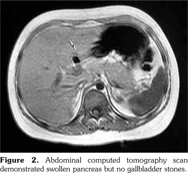 An 11-year-old girl was admitted to our department with a six-month history of anorexia and rashes on her face and extremities (Figure 1). On admission, her axillary temperature was 37.7°C, heart rate was 130 beats/minute, blood pressure was 82/47 mmHg, respiratory rate was 22 breaths/minute, and oxygen saturation was 95%. Cardiac examination revealed a soft systolic murmur at the apex with low heart sounds. She had malar rash, discoid rash, hepatosplenomegaly, and edema of the lower extremities. The subsequent autoimmune and serologic workup came back positive for anti- nuclear antibody at a titer of 1:3200, positive anti- double stranded deoxyribonucleic acid, anti-Smith antibody, and low complements (0.28 g/L) and complement 4 (C4) (0.03 g/L). Other laboratory studies exhibited anemia (red blood cell 3.1∞1012/L, hemoglobin 99 g/L), proteinuria (24-hour urine protein 300 mg/day), elevation of acute-phase reactants (C-reactive protein 132 mg/L, erythrocyte sedimentation rate 54 mm/hour), hyperamylasemia (208 units/L), hyperlipasemia (1556 units/L), and raised creatine kinase (CK, 375 units/L) and CK-MB (83 units/L). Electrocardiogram revealed sinus tachycardia with T wave inversion. Echocardiography showed normal left ventricular size but global hypokinesia with an ejection fraction of 37%. Abdominal computed tomography demonstrated swollen pancreas but no gallbladder stones (Figure 2). Renal biopsy revealed diffuse proliferative glomerulonephritis Class IV-G. Our patient was diagnosed as having systemic lupus erythematous (SLE) complicated by pancreatitis and myocarditis. SLE disease activity index score was 24. She was treated with a course of pulse methylprednisolone 10 mg/kg/day for three days and subsequently converted to oral prednisone (60 mg/day). In addition, several symptomatic treatments such as bowel rest, nutritional support, somatostatin, and fructose-1,6-diphosphate were also adopted. One month later, intravenous cyclophosphamide 500 mg/m(2) was given. Two months later, repeated echocardiography showed a marked improvement in ejection fraction, abdominal computed tomography revealed a less swollen pancreas, and SLE disease activity index score was 2. The patient was discharged with normal pancreatic (amylase 109 units/L, lipase 285 units/L) and myocardial enzymes (CK 29 units/L, CK-MB 11 units/L).