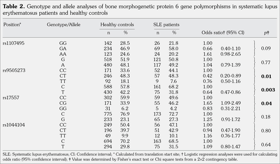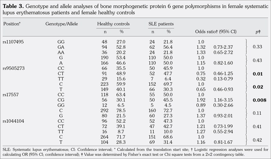 Patients and methods: We analyzed the genotype and allele frequencies of BMP6 SNPs using genomic deoxyribonucleic acid isolated from 119 SLE patients (9 males, 110 females; mean age 36.4 years; range 19 to 59 years) and 509 healthy controls (323 males, 186 females; mean age 42.1 years; range 19 to 61 years). Genomic deoxyribonucleic acid was extracted from peripheral blood leukocytes using a standard phenol-chloroform method or by using a genomic deoxyribonucleic acid extraction kit. Erythrocyte sedimentation rate, C-reactive protein, and antinuclear antibody levels of SLE patients were recorded.