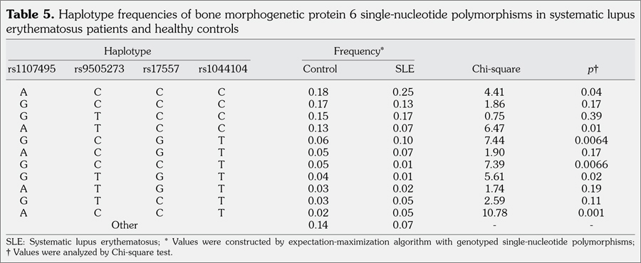 Results: Our results showed that the genotype frequencies of rs17557 and rs9505273 for BMP6 in SLE patients significantly differed from those of the control group (p=0.01 and p=0.04, respectively). The genotype frequencies of the rs17557 and rs9505273 for BMP6 in female SLE patients were also significantly different from those in female healthy controls (p=0.04 and p=0.03, respectively). We also revealed that the distribution of the main haplotypes of BMP6 SNPs in SLE patients was significantly different from their distribution in healthy controls.