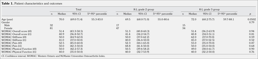 Patient characteristics and WOMAC overall and sub-scale scores at t0 and t1 were listed in Table 1. There were no statistically significant differences in terms of sex prevalence and WOMAC scores (both in t0 and t1) between K-L scale grade 2 and 3 groups. The discrepancy between the median ages of the above mentioned groups of 2.5 years was slightly higher than the p value cut-off considered statistically significant (p=0.0502).
